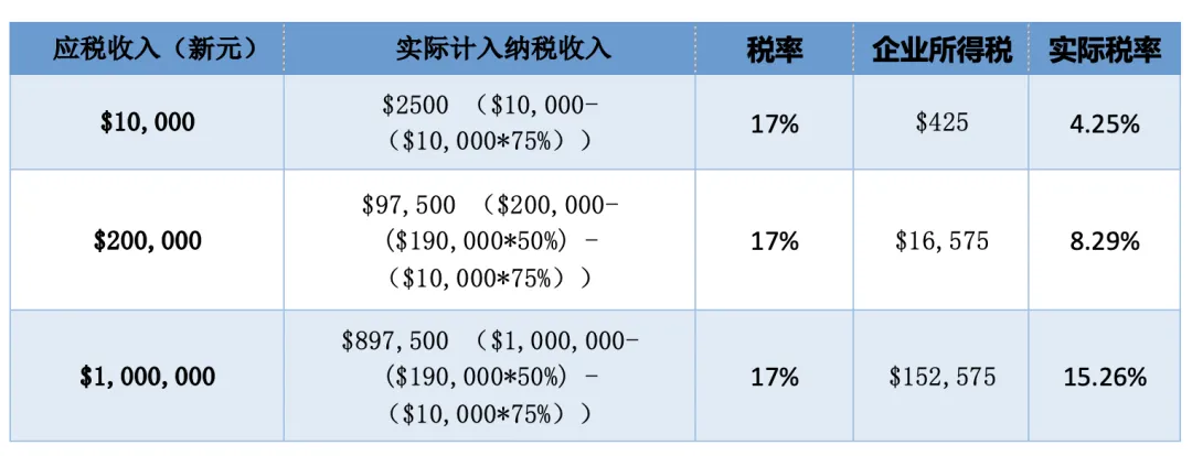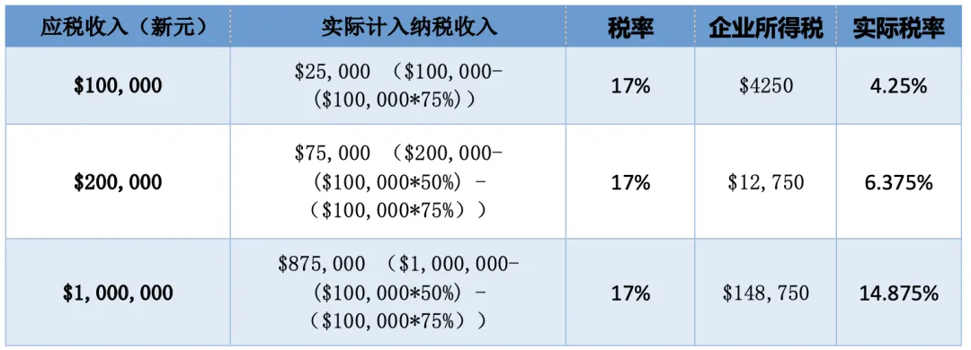 新加坡公司所得税为17%, 但新加坡政府重视对小微企业的税收扶持,对于低收入的小微企业,实际税率远远低于17%。以2020年最新政策为例,首1万新币税前收入可以减免75%应税额,1万至20万税前收入可以减免50%应税额。举例说明: